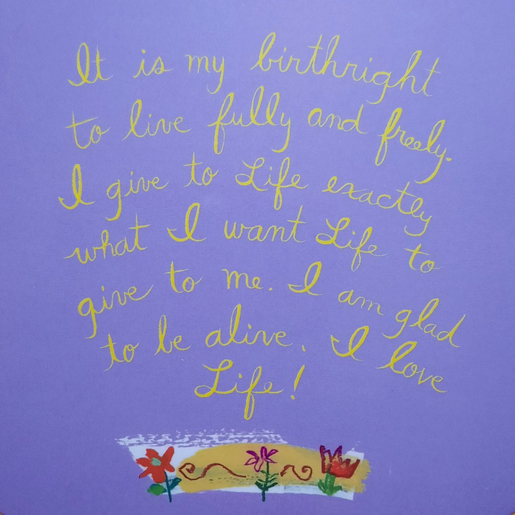 “It is my birthright to live fully and freely. I give to Life exactly what I want Life to give to me. I am glad to be alive. I love Life!”