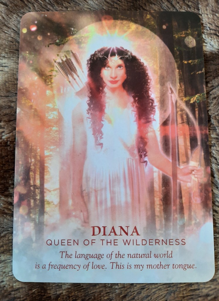 “Diana represents the call to embody a more primal connection to the wildness that exists within… Sometimes the answer is the simple, elemental need to just walk barefoot in the grass… Sometimes we get so caught up in what’s happening (our what isn’t happening) that we forget to just be… that there is tremendous power surging up from the earth wanting to take whatever energy is no longer serving us…”