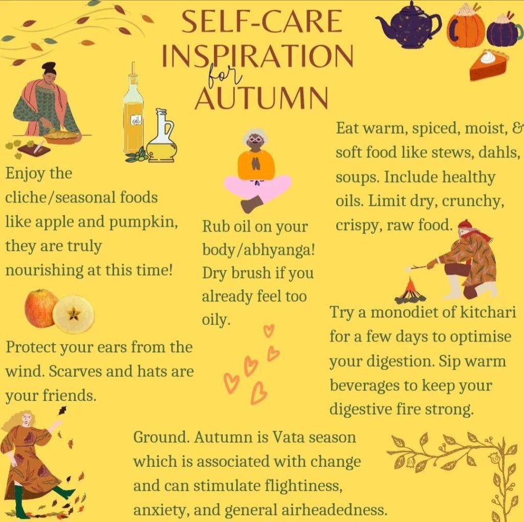 Here is some inspiration to help you maintain wellness during the changing seasons. Keep in mind these are some ideals and you aren’t being asked to implement everything all at once. You are welcome to choose any or none of these ideas to try! If something is not in your wheelhouse or means (like access to whole, organic, natural food or essential oils) don’t get caught up there. Start with what feels good or interests you and maybe get creative with some alternative ideas. Creativity is a super power of Vata. Or feel free to ask me!